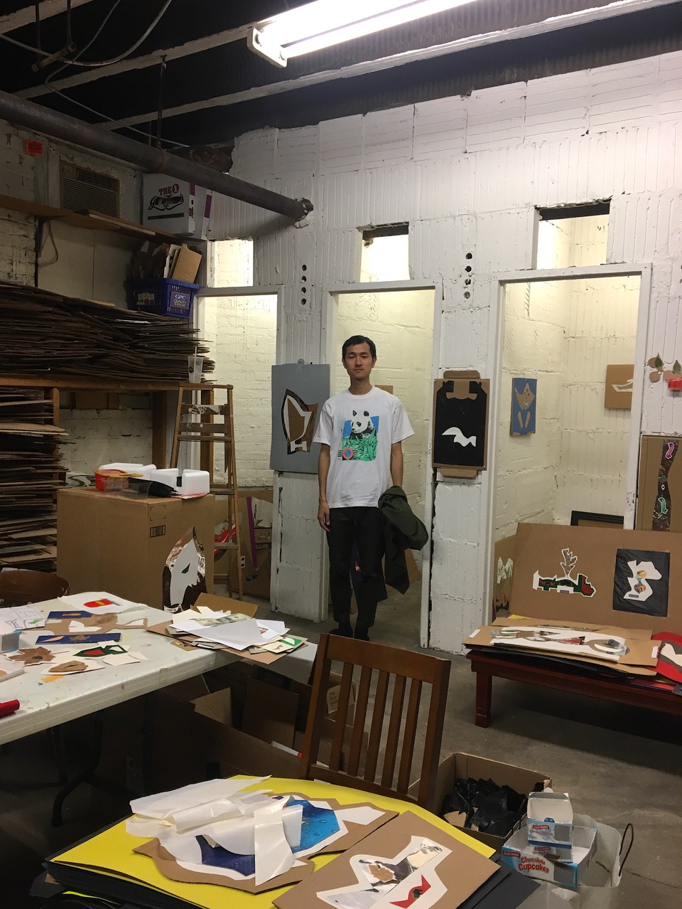 コンがシカゴ郊外で営んでいた小さなコンビニエンスストア「KIM’S CORNER FOOD」の店内を飾り付けるため、60歳を過ぎてから作り始めた小さなコラージュ。お菓子や煙草の空き箱、包み紙、新聞や雑誌の切り抜き、ビニール袋、不要になったダンボールなど、身近にあるものを使ったコラージュは、いつしか店内を埋め尽くし、お店そのものをアート作品に、そして彼をアーティストに変えました。