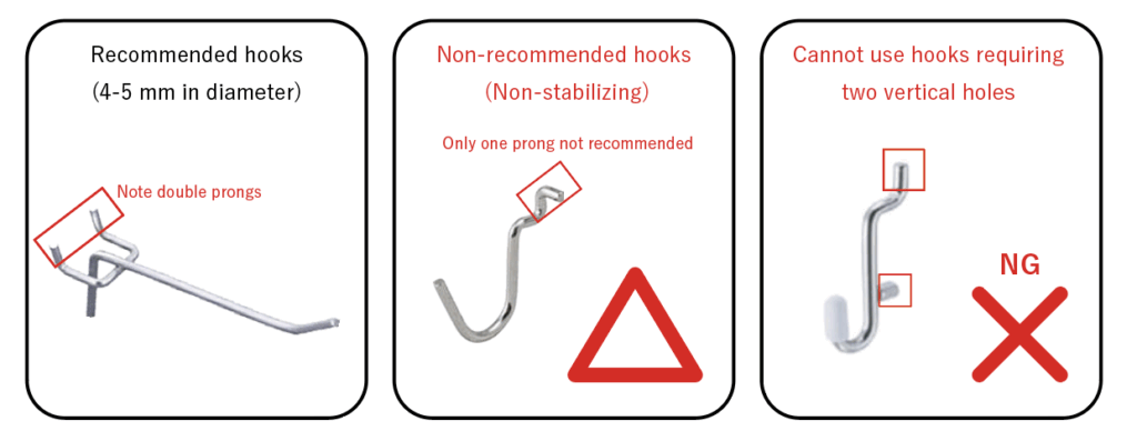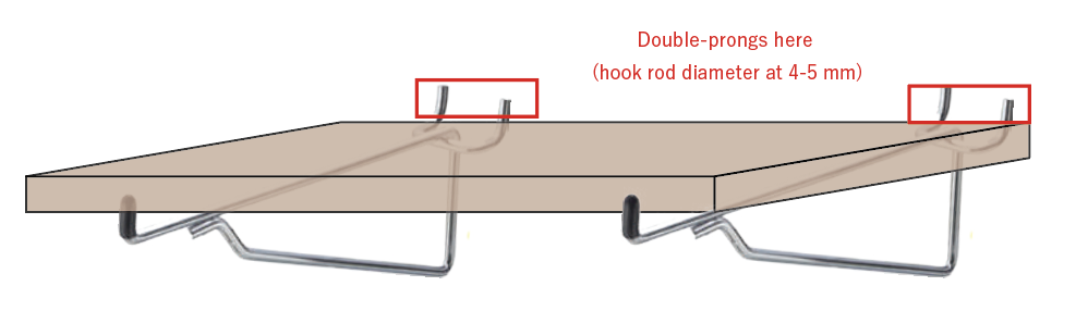 ● Hooks or shelf brackets can be attached to the 5.5mm wide slits at 40cm intervals. If you are bringing your own hooks, we recommend “double hooks” with a rod diameter of 4-5mm and two supports.