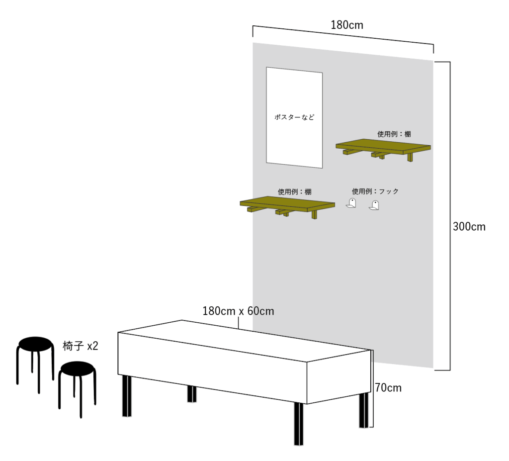 テーブルの上には什器を設置いただけますが、周りの出展者の方への配慮をお願いいたします。