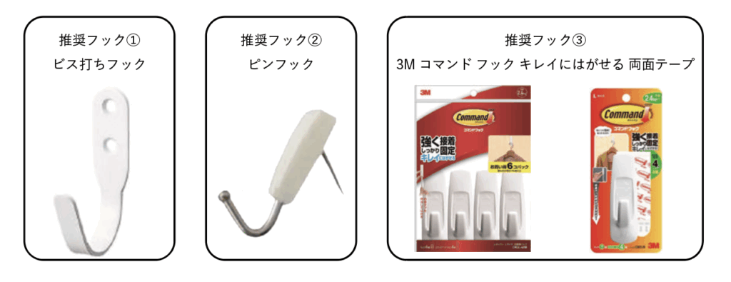 ご自身でフックをご用意される場合、ビス打ちフックやコマンドフックをお勧めします。